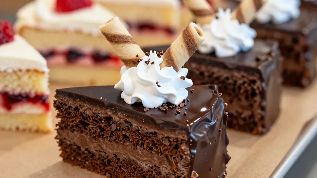 A close-up of a decadent chocolate ganache cake slice topped with whipped cream and wafer sticks, highlighted by warm, soft lighting that accentuates the glossy surface and creamy textures. The blurred background of other cake slices adds depth and context, making it ideal for culinary and dessert-themed designs.