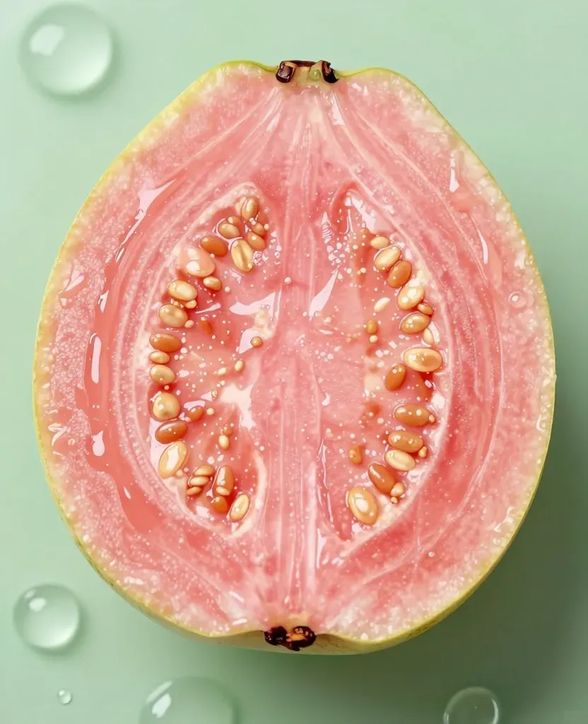 A close-up of a halved guava revealing its vibrant pink flesh and glossy golden-brown seeds, illuminated by soft, diffused natural light that enhances the fruit's texture and color. The light green background with blurred water droplets adds a fresh, natural feel, providing ample copy space for design integration.