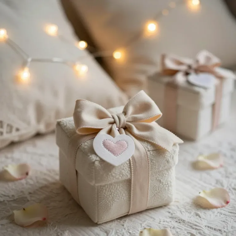 A beautifully wrapped gift box with a cream ribbon and a heart-shaped tag, set against a backdrop of warm fairy lights and delicate petals, creating a soft and romantic ambiance. The shallow depth of field draws attention to the central gift box, making it perfect for product or gift-related designs.