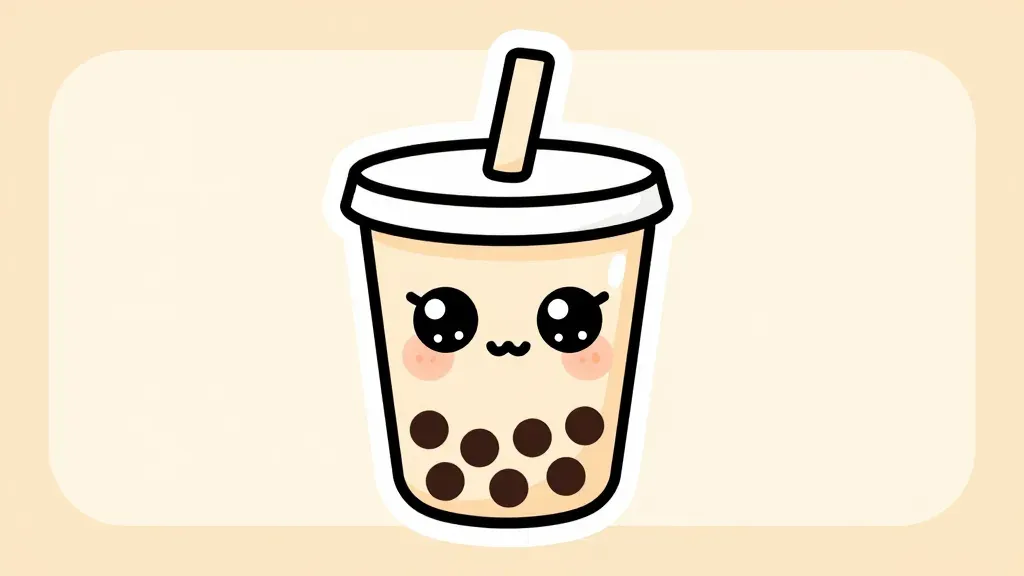A cute, cartoon-style bubble tea cup with a smiling face, rosy cheeks, and visible tapioca pearls, rendered in smooth, glossy textures. The image features soft, even front lighting with gentle highlights on the cup rim and pearls, set against a plain beige background with rounded corners framing the subject like a digital sticker.