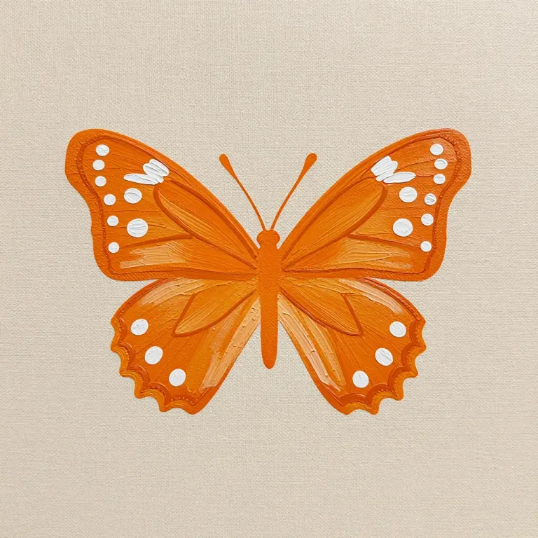 A vibrant orange butterfly with glossy wings and white spots is centered on a neutral beige canvas, illuminated by a top-down light source that creates subtle shadows and highlights. The balanced composition and slightly blurred background emphasize the butterfly, making it perfect for design elements or product backgrounds.