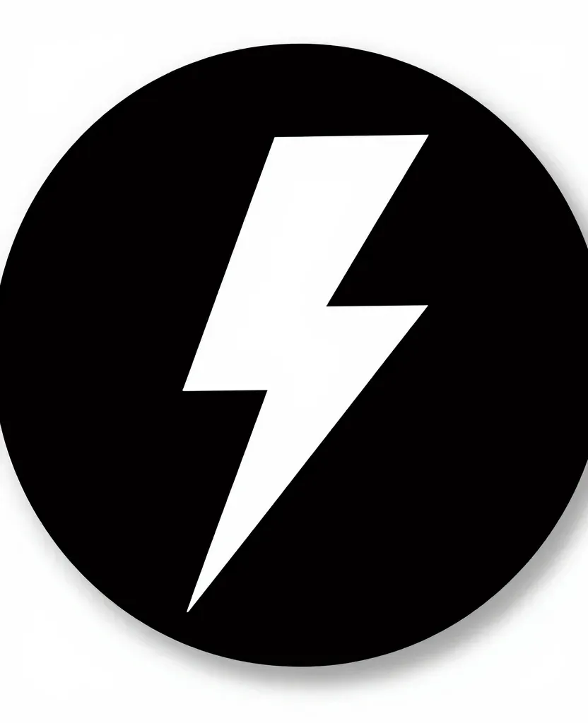 A glossy, reflective lightning bolt centered within a black circle, illuminated by direct, high-contrast lighting. The clean, solid black background provides a stark contrast, emphasizing the bolt's sharp, dynamic shape.