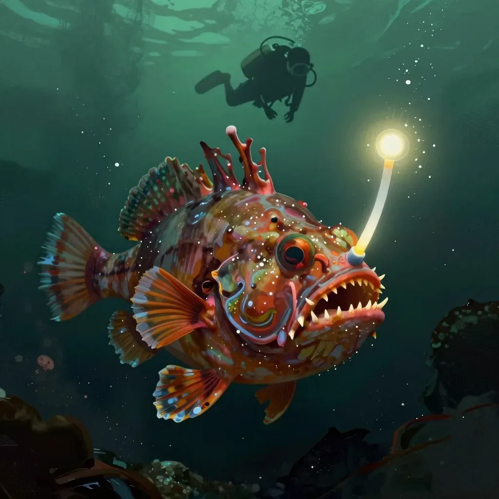 An abyssal anglerfish with rough, barnacle-encrusted skin and sharp, jagged teeth glows with a translucent gelatin lure, while a diver observes in the dim, green-hued depths. The image features dramatic low-light illumination with a strong focal point on the lure, set against a dark, textured seabed with shallow depth of field and ample negative space.