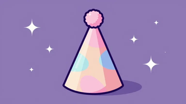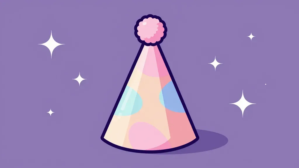 A glossy party hat with a fluffy pink pom-pom, softly lit to create a shimmering effect, set against a purple background with white star patterns, slightly blurred to emphasize the hat.