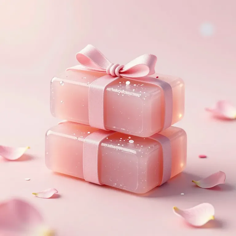 Stacked iridescent soap bars wrapped in pink ribbons, glowing under soft diffused light, creating a dreamy and romantic atmosphere with a blurred background of pink petals and pastel hues.