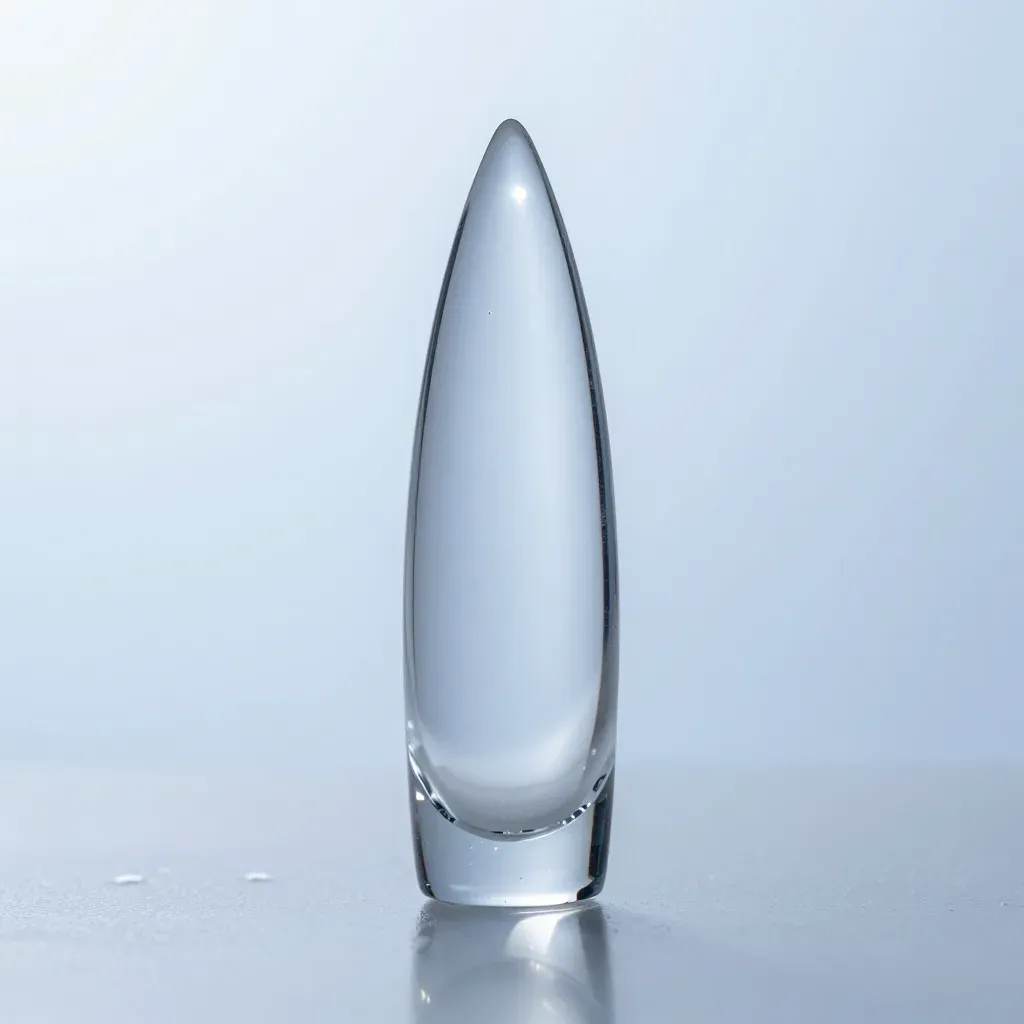 A polished, translucent teardrop-shaped crystal reflects soft, diffused light, creating a pristine white and clear appearance with subtle gray tones in the shadow. The clean, minimalistic white background enhances the crystal's elegant simplicity and depth of field.