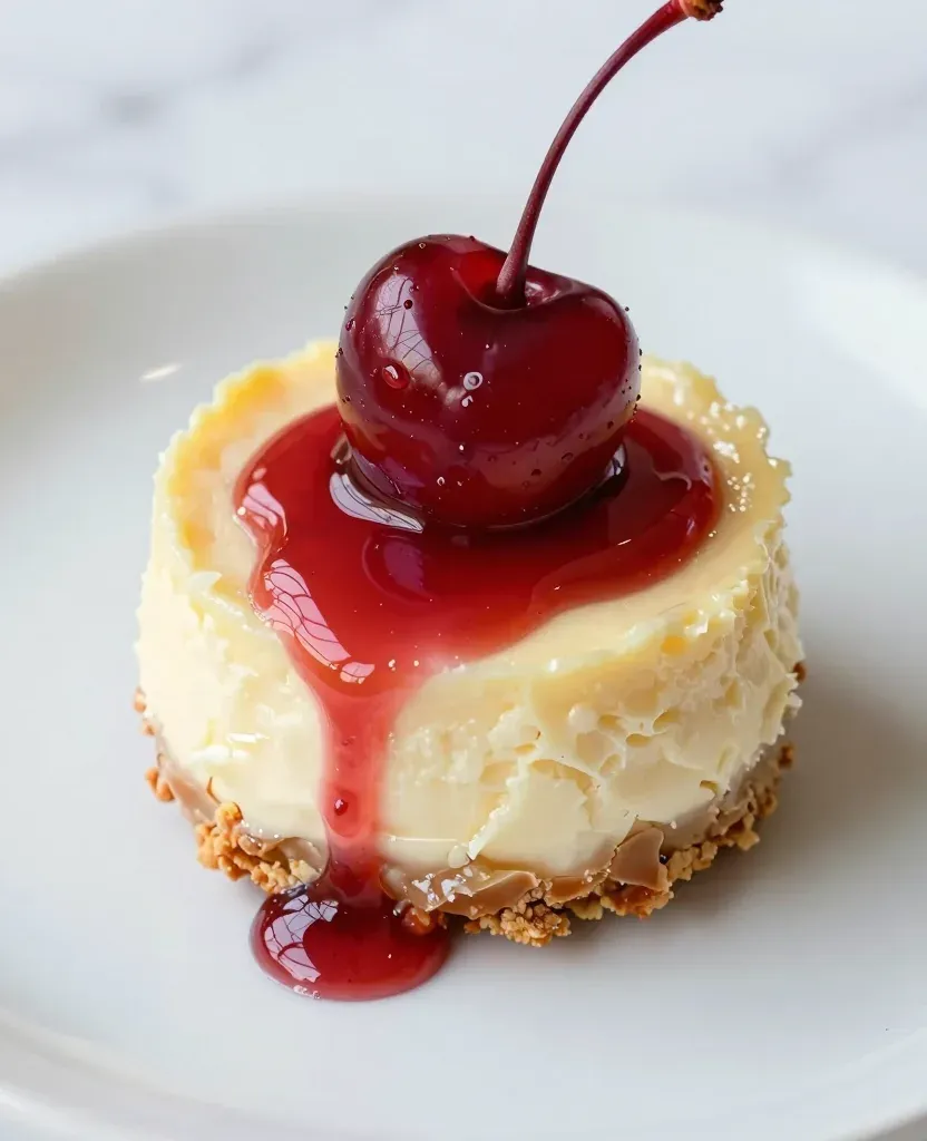 A single mini cheesecake bite features a smooth creamy filling, crumbly graham cracker crust, and a glossy cherry sauce with a whole cherry on top. Soft diffused lighting highlights the textures, while a shallow depth of field isolates the subject against a clean, out-of-focus marble background.