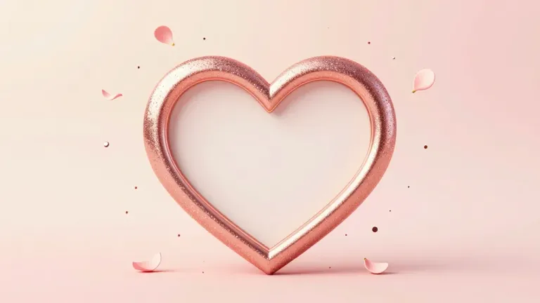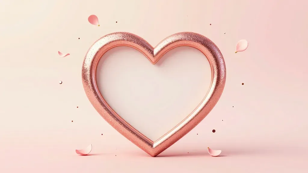 A shimmering rose-gold heart frame with soft pink petals floating around, creating a romantic and ethereal atmosphere. The warm, directional lighting highlights the glittery texture, emphasizing the frame's elegant design and the delicate floating petals add depth and visual interest.