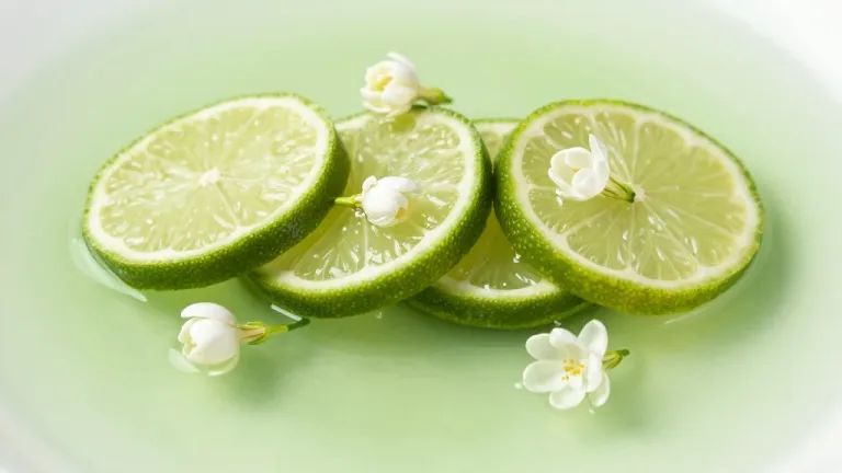Sliced lime and delicate jasmine flowers float in soft, diffused light, creating a serene and harmonious composition. The pale green background enhances the tranquil and ethereal mood of the image.