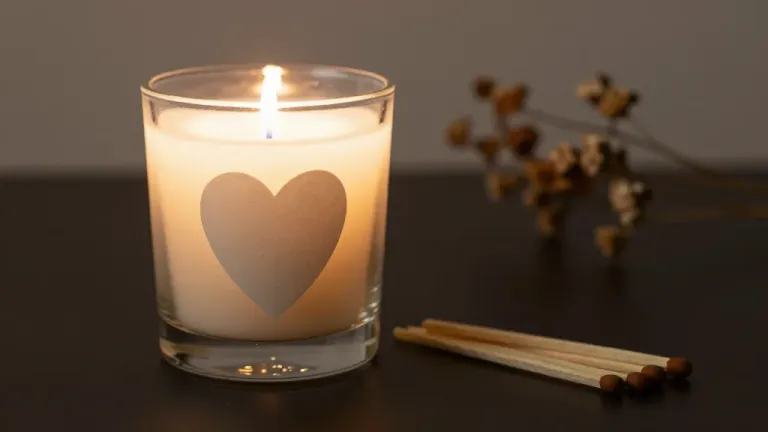 A close-up of a frosted glass jar containing a heart-shaped candle, softly glowing with warm light, creating a serene and intimate atmosphere. The blurred background of delicate dried flowers and matches adds depth and texture to the composition.