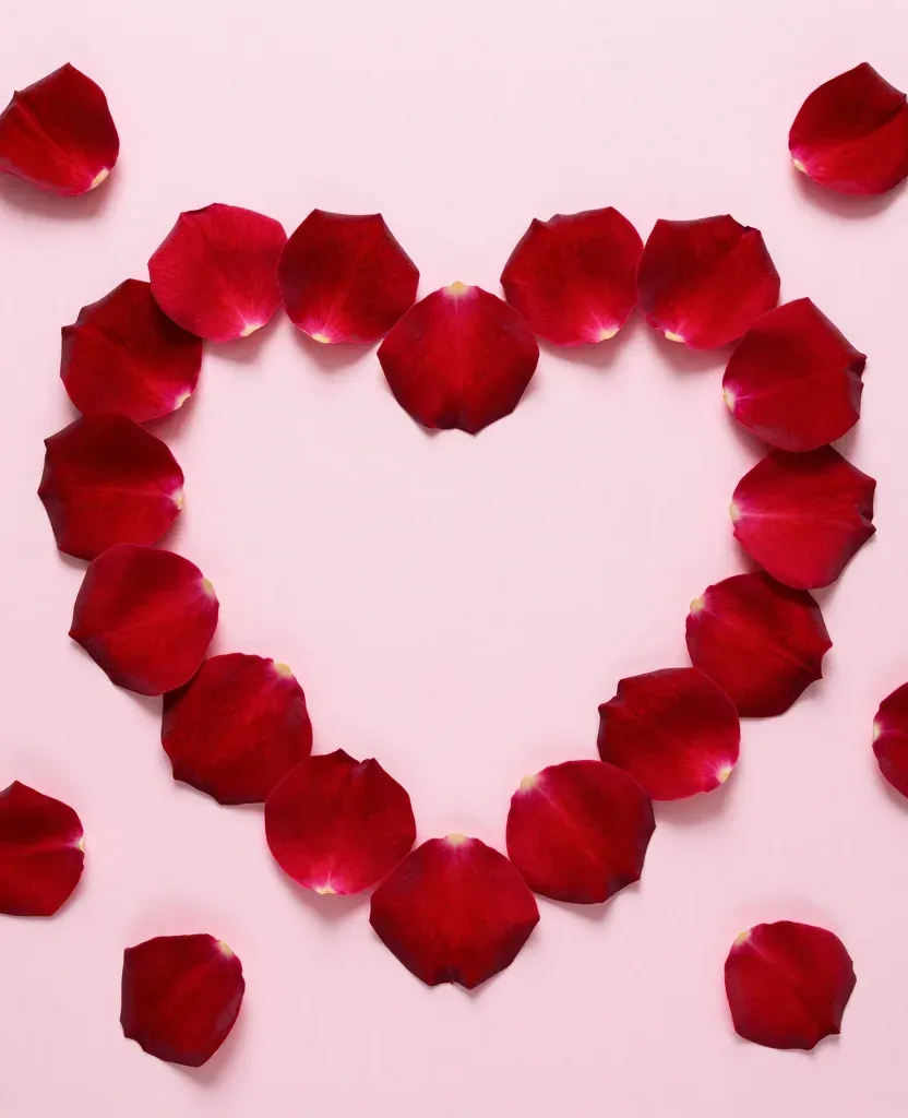 A heart-shaped arrangement of glossy, deep red rose petals with slightly serrated edges, softly illuminated by diffused, warm light, creating a romantic and symmetrical composition against a pale pink, blurred background. The sharp focus on the petals and soft background elements provide a clean and elegant visual for design purposes.