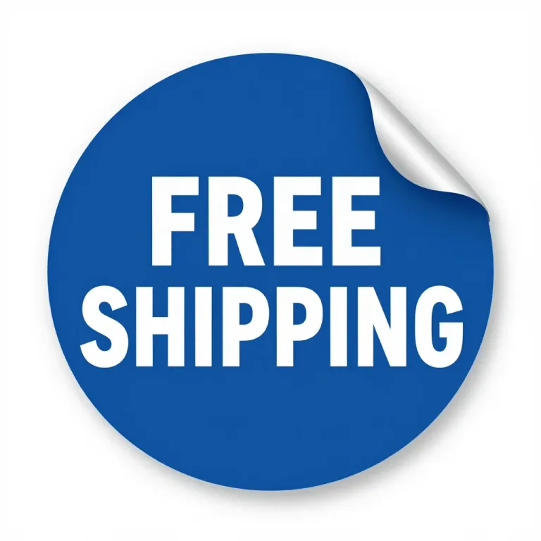 A glossy, blue circular sticker with the text 'FREE SHIPPING' in white, centered on a plain white background. The direct lighting highlights the glossy surface, creating a clean and simple composition.