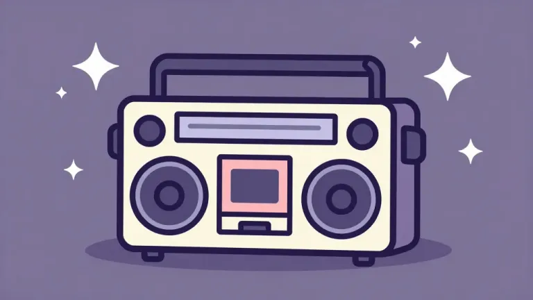 A retro boombox speaker gleams under soft, diffused lighting, set against a starry purple background, creating a nostalgic and atmospheric scene. The centered composition and subtle gradients in the background add depth and visual interest.
