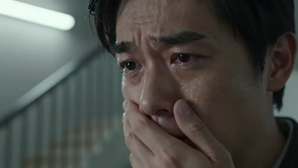 A man with tears streaming down his face presses his hands against his face, conveying deep emotional distress. The harsh fluorescent lighting and shallow depth of field emphasize the subject's emotional state and create a dramatic, intimate portrait.