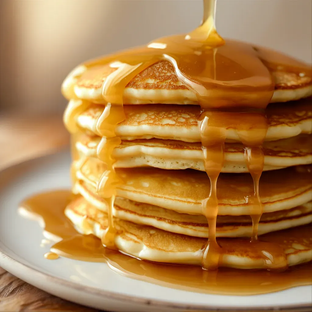 A stack of soft, fluffy pancakes is generously drizzled with a glossy, amber salted caramel sauce, highlighting the golden hue and glossy texture. The warm, diffused lighting and shallow depth of field ensure the focus remains on the appetizing stack, with a blurred neutral background.