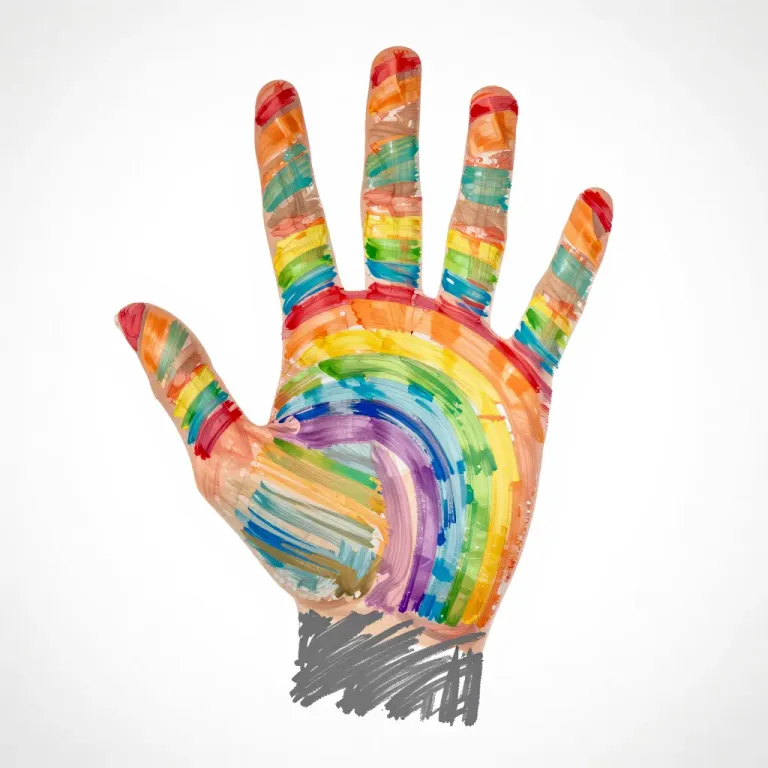 A hand with a palm facing forward, painted in vibrant rainbow colors, under direct overhead lighting that creates highlights and shadows, set against a clean, minimalistic white background with slight blur.