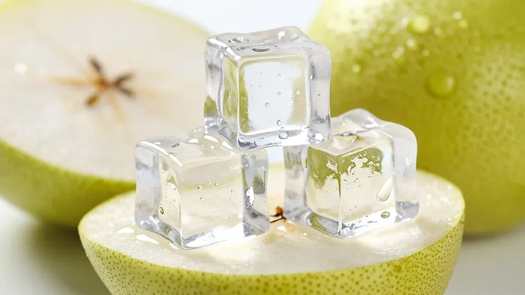 A close-up of a halved pear with ice cubes balanced on its flesh, illuminated by direct, high-contrast lighting that highlights the textures and creates a glossy sheen. The shallow depth of field blurs the background, featuring another pear and a star anise, providing context without distraction.
