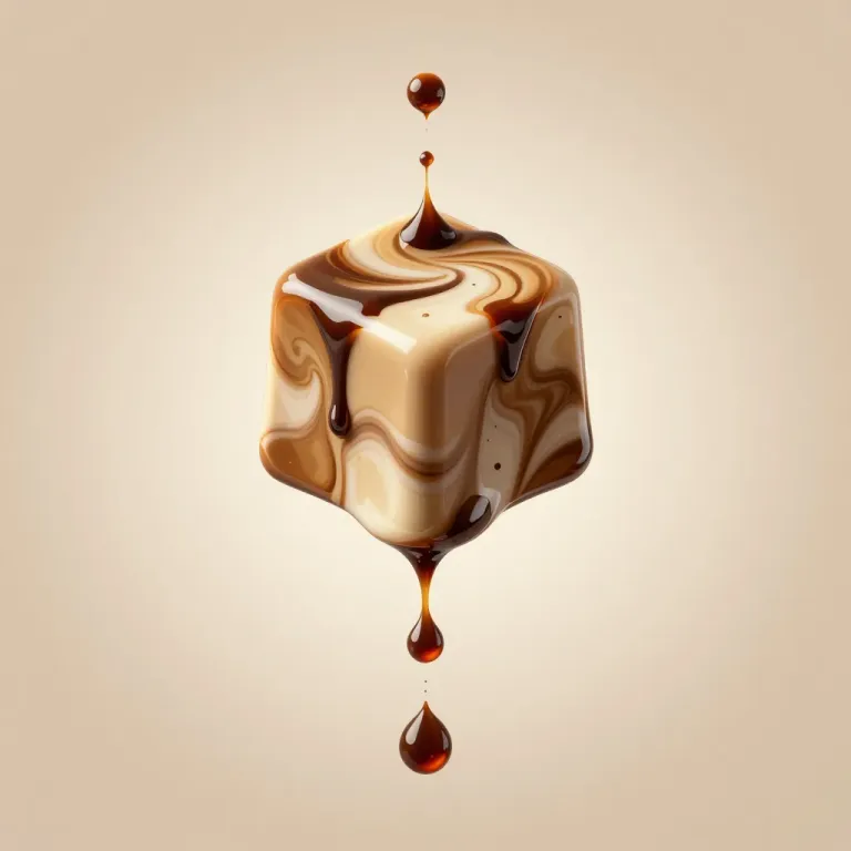 A glossy, creamy cube-shaped dessert cascades with coffee and cream, creating a visually striking effect. The direct overhead lighting highlights the dessert's smooth texture and vibrant color contrast against a warm beige background, providing ample copy space.