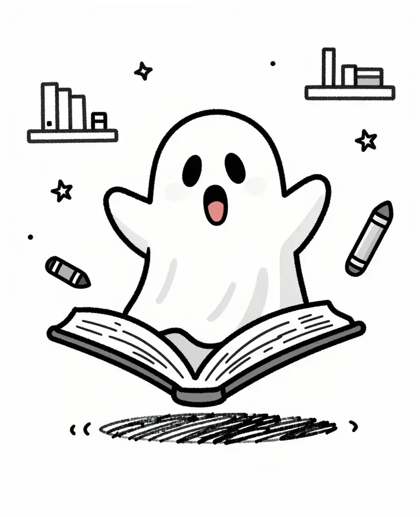 A translucent ghostly figure emerges from an open book, with slightly frayed pages, in a softly lit, cozy library setting. The composition is centered, with shelves and scattered pencils in the background, creating a serene and magical atmosphere.