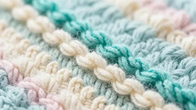 A close-up of soft, glossy chenille bands in pastel blues, pinks, and whites, highlighting intricate loops and knots under natural, soft lighting. The blurred background emphasizes the texture and colors, offering a clean and focused composition.