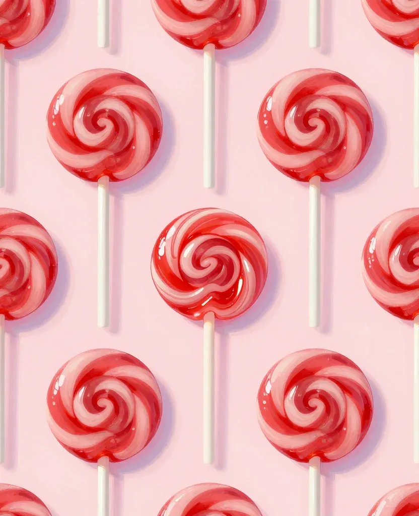 A top-down view of swirled lollipops on white sticks, set against a soft pink background. The image features a gentle diffused light creating highlights and shadows, emphasizing the glossy texture of the candy and the evenly spaced lollipops in a grid-like pattern.