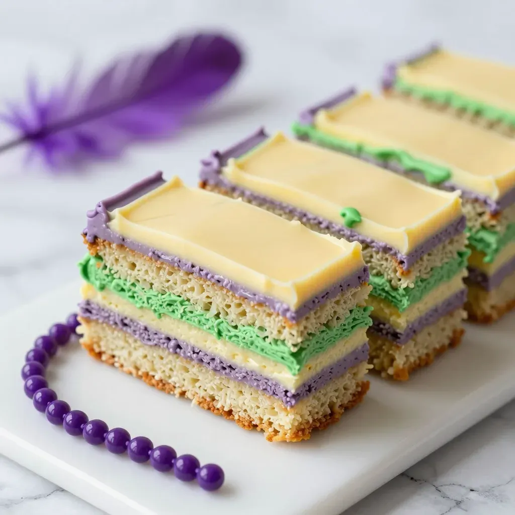 Glossy yellow frosting and soft crumbly cake layers create a visually appealing dessert, highlighted by soft, diffused lighting that enhances the glossy texture and casts gentle shadows. The blurred background featuring a purple feather and beads adds elegance and playfulness, making the image ideal for culinary and food photography.