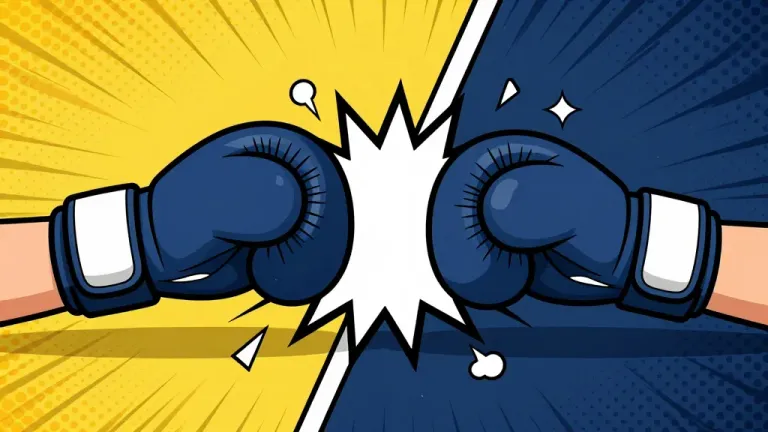 Two navy blue boxing gloves collide mid-air, creating a sharp white burst with paper-cut texture, set against a split yellow and blue background with radiating speed lines. The high-contrast, stylized lighting and symmetrical composition with halftone dots emphasize dynamic energy and graphic clarity, suitable for editorial or promotional designs.