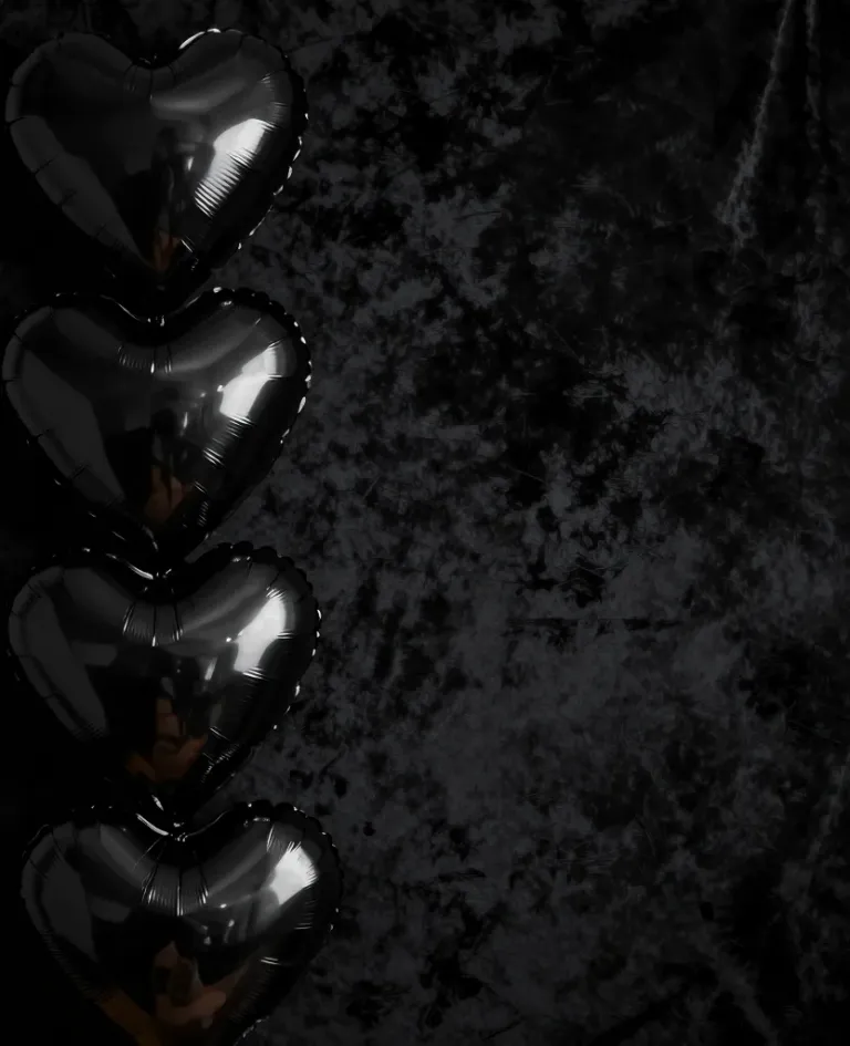 A close-up of metallic silver heart-shaped balloons against a dark, textured velvet background, creating a luxurious and elegant atmosphere. The dim, diffused lighting highlights the balloons' reflective surfaces and soft shadows, adding depth and a sense of intimacy to the composition.