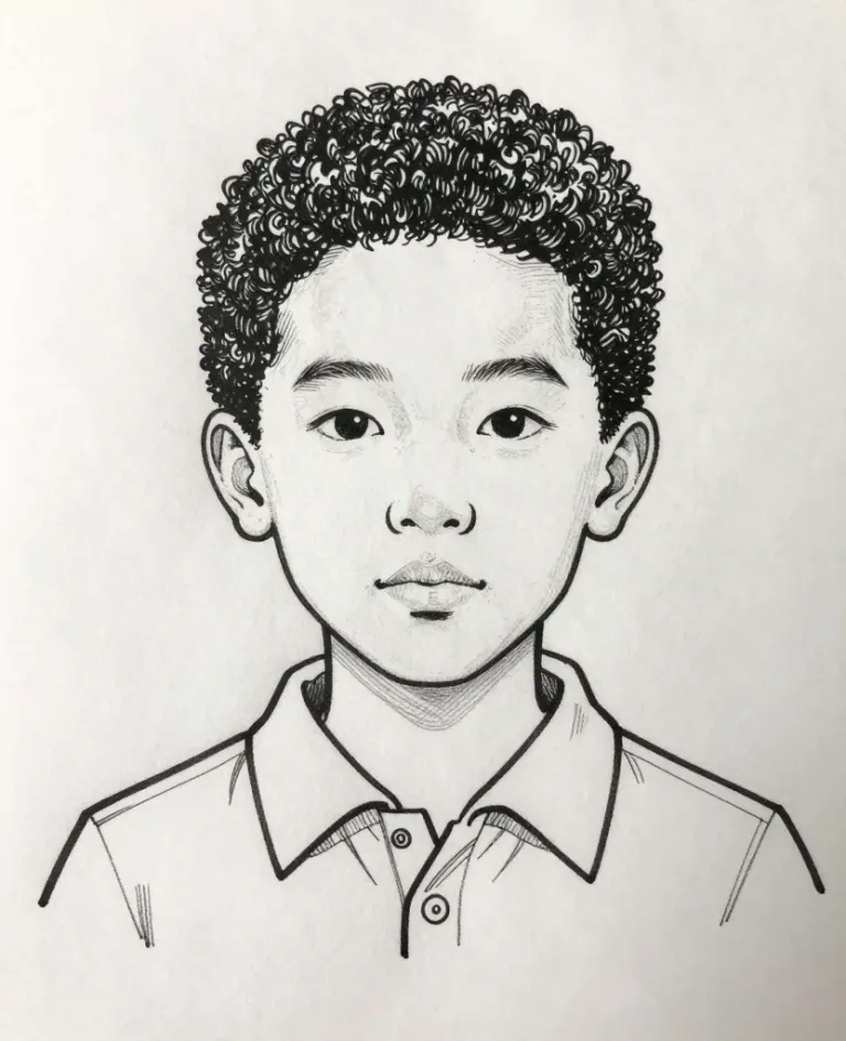 A young boy with curly hair and a collared shirt is depicted in a close-up portrait with soft, even lighting and subtle shadows. The plain background ensures the focus remains on the subject, highlighting the detailed shading and texture of the hair and shirt.
