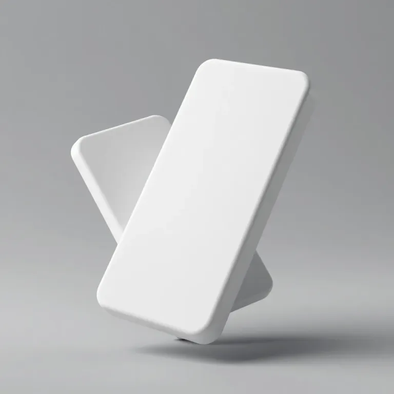 Two glossy white cuboids balanced on each other, creating a minimalist and modern aesthetic. The side lighting highlights the smooth texture and reflections, emphasizing depth and dimensionality.
