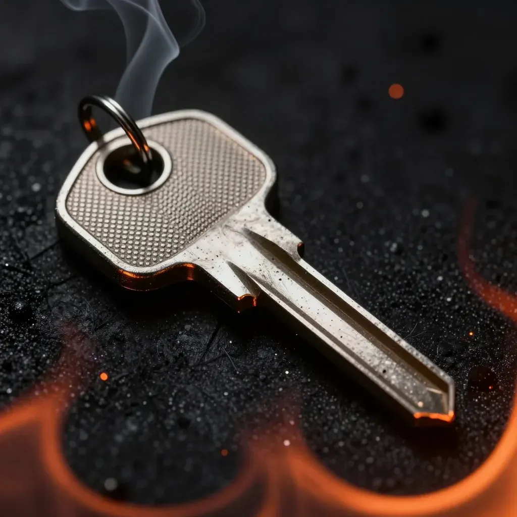 A metal key with a textured surface is illuminated by firelight, casting a warm glow and reflections on the glossy dark background. The shallow depth of field isolates the key, emphasizing its intricate details and the smoke rising from the keychain.