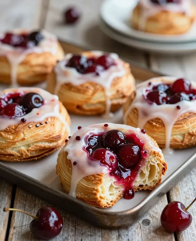 Golden-brown flaky pastries are topped with a glossy, deep-red cherry compote and a creamy white glaze, creating a visually appealing and appetizing dessert. The diffused, warm lighting highlights the textures and colors, while the shallow depth of field and slightly blurred background emphasize the pastries, making them the focal point of the image.