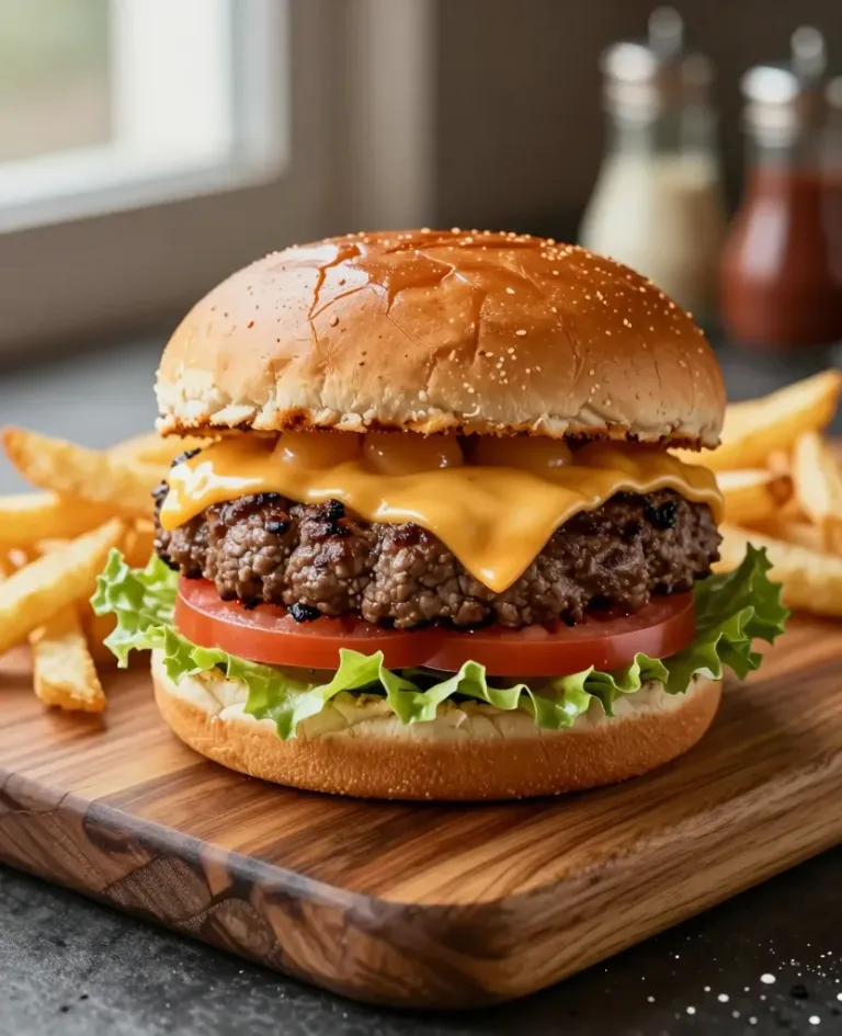 A juicy beef burger with melted cheese, fresh tomato, crisp lettuce, and a toasted sesame seed bun is served on a rustic wooden board alongside golden fries. Soft natural light from the left highlights the glossy cheese and textured bun, while a shallow depth of field isolates the subject against a blurred kitchen background with condiment bottles and a window.