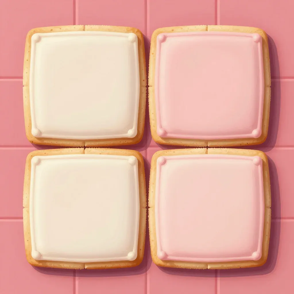 Four square biscuits with glossy white and pink icing, arranged in a 2x2 grid against a clean pink background. Soft, diffused lighting highlights the texture and creates a balanced, symmetrical composition.