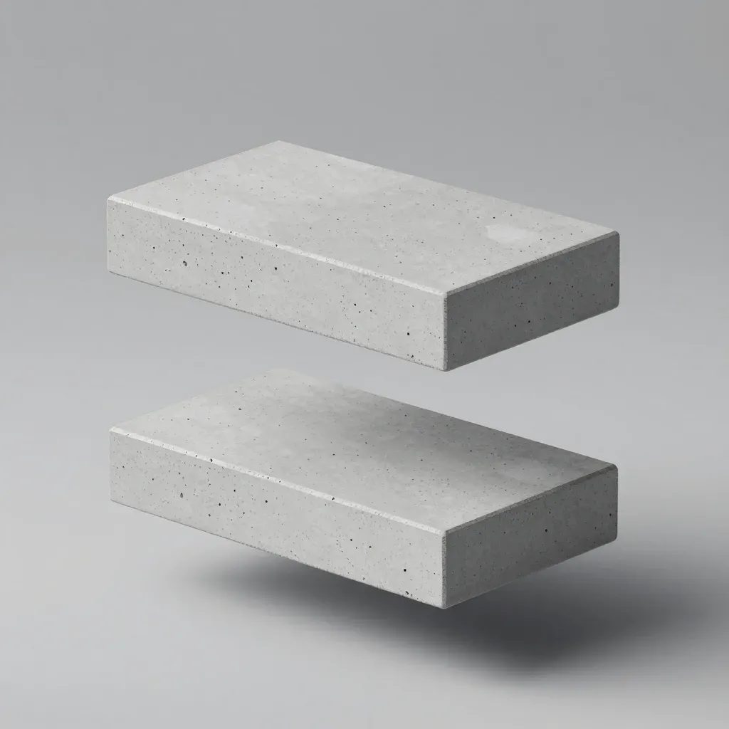 Two smooth concrete prisms with speckled textures float above each other, illuminated by soft, diffused light that highlights their three-dimensional form. The neutral gray background isolates the prisms, emphasizing their texture and form.