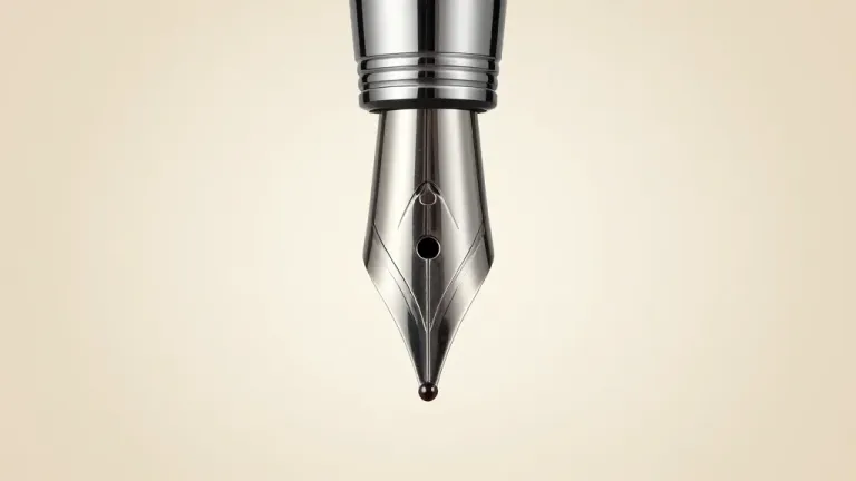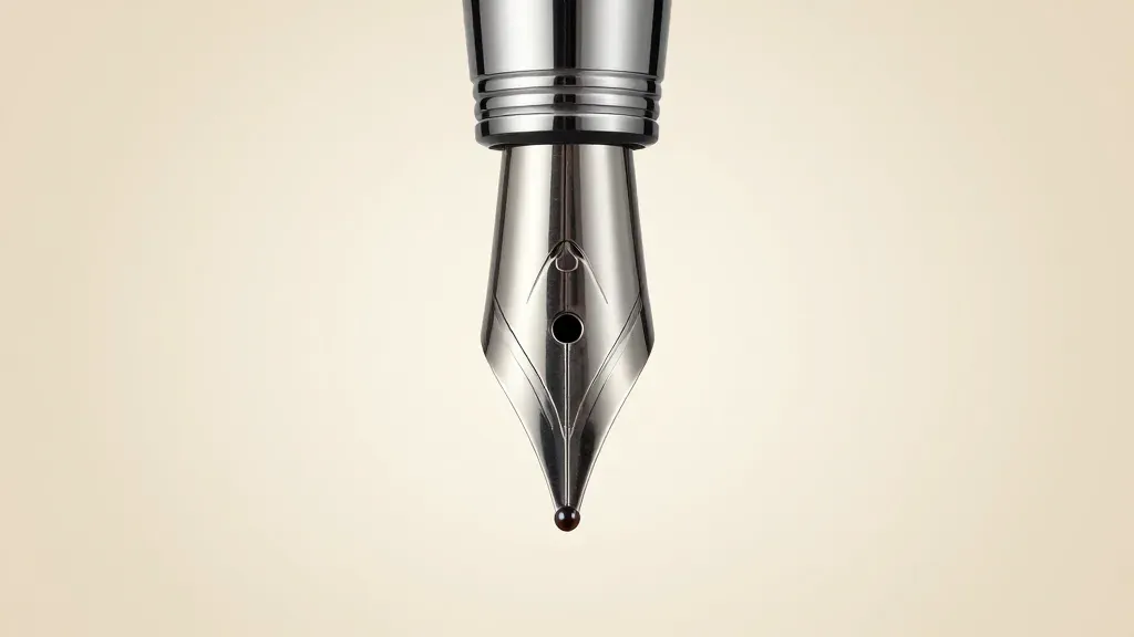 A polished silver fountain pen nib releases a glossy ink drop against a soft, diffused light, creating a shallow depth of field that blurs the neutral beige background, emphasizing the subject's reflective surfaces and the precision of the ink drop.
