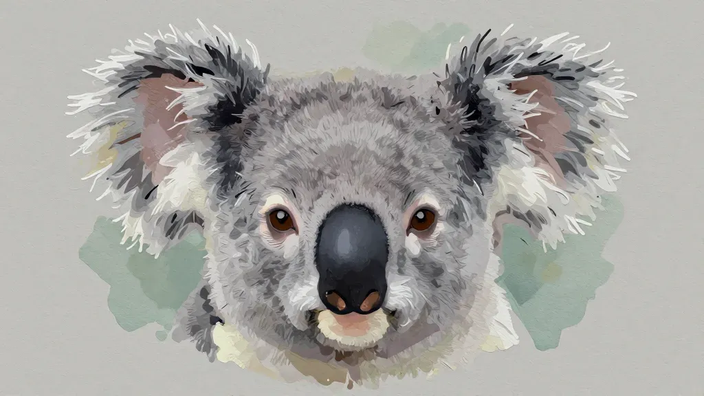 A close-up of a koala's face, showcasing its expressive eyes and soft, velvety fur in a diffused, soft light that creates gentle shadows and highlights. The neutral, blurred background complements the subject, providing a clean and focused composition.