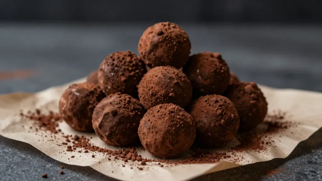 Smooth, glossy chocolate truffles are piled with cocoa dust, creating a rich, decadent texture. Soft, diffused lighting highlights the truffles' smooth surfaces and cocoa-dusted exteriors, emphasizing their luxurious appeal against a clean, minimalist background.