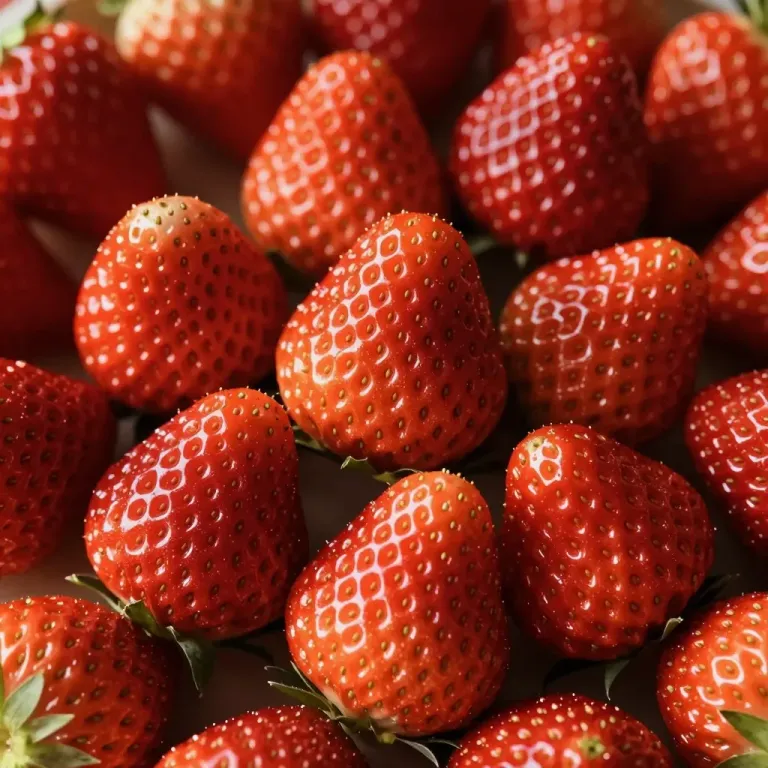 A close-up of sunlit strawberries with a glossy, smooth texture and a slight sheen, creating highlights and reflections. The blurred background emphasizes the strawberries as the main subject, offering a shallow depth of field.