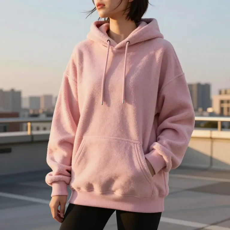 A person wearing a soft, plush pink hoodie stands on a rooftop, hands in pockets, bathed in warm, golden sunlight. The shallow depth of field and blurred city skyline emphasize the subject, creating a serene and stylish urban scene.
