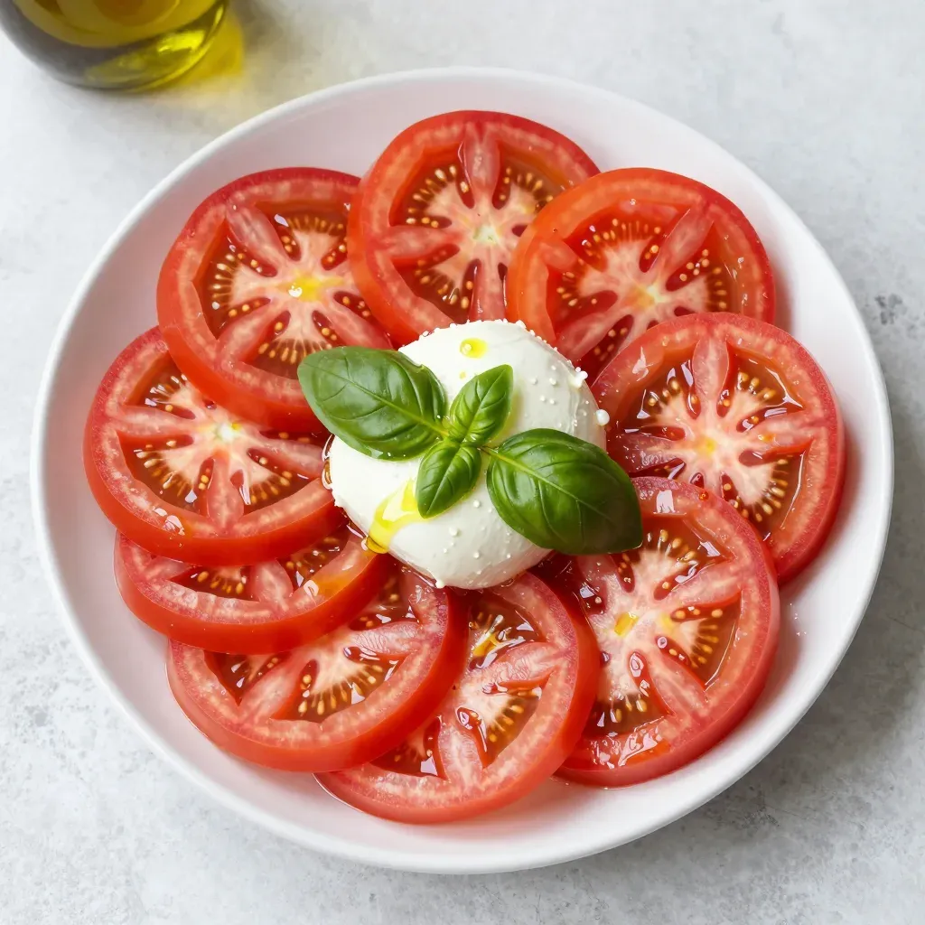 Sliced tomatoes arranged in a circular pattern around a creamy burrata cheese topped with fresh basil, all presented on a matte white ceramic plate. Soft diffused natural light from the upper left highlights the glossy texture of the tomatoes and the smooth surface of the cheese, with a shallow depth of field isolating the subject against a blurred light grey textured background.