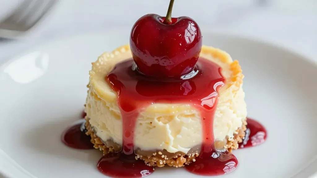A creamy mini cheesecake bite with a crumbly graham cracker crust is crowned with a whole cherry and drizzled with viscous crimson sauce, its glossy surface catching soft natural light. The shallow depth of field and tight close-up framing emphasize texture and detail against a clean, out-of-focus white background.