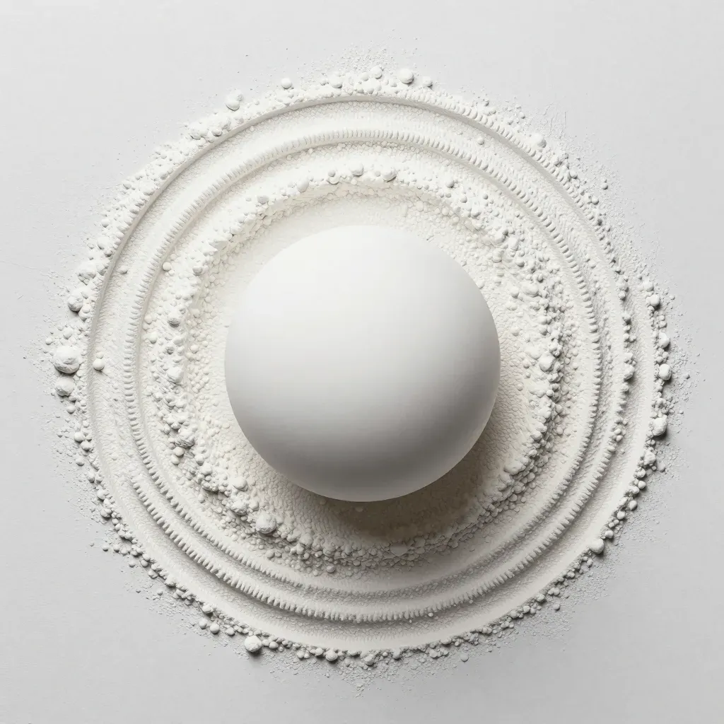 A glossy ceramic sphere is surrounded by concentric rings of granular texture, illuminated by diffused light that creates soft shadows and highlights. The plain white background emphasizes the subject and provides ample copy space.