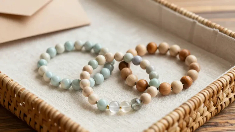 Three beaded bracelets made of smooth, polished wood and stone beads rest in overlapping circles on a soft fabric-lined rattan tray, showcasing earthy tones and natural textures. Soft natural light from the upper left creates gentle highlights and shallow shadows, with a shallow depth of field and diagonal framing that draws focus to the bracelets while the blurred wooden background and kraft envelope suggest a gifting context.