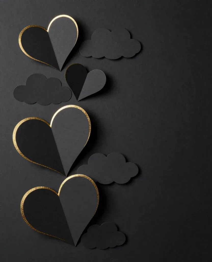 Glossy black hearts and clouds with gold edges are arranged in a vertical column against a matte black background, creating a striking contrast and soft, diffused lighting enhances the three-dimensional appearance of the shapes.