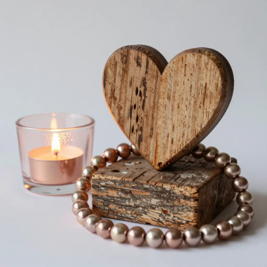 A carved wooden heart sits atop a block of reclaimed wood, encircled by a strand of rose-gold pearls, with a lit tea-light candle casting a warm glow. Soft directional lighting from the left highlights the glossy pearls and wood grain, while a shallow depth of field isolates the subject against a clean, neutral background.