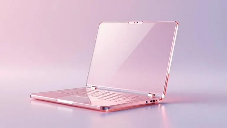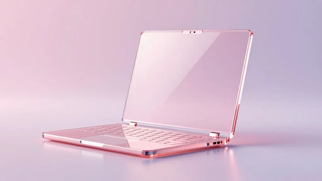 A sleek, rose-gold laptop with a glossy finish is open, showcasing its reflective screen and keyboard. The soft, diffused lighting highlights the smooth texture and vibrant color palette of rose-gold, white, pink, and purple, creating a minimalist and elegant composition with ample copy space.