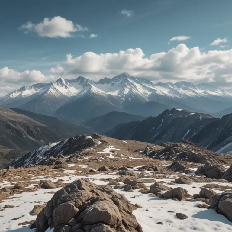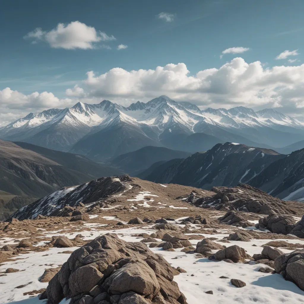 A wide-angle shot of rugged, snow-dusted rocks leading to a distant mountain range under warm sunlight. The composition emphasizes depth and texture, with soft snow and earthy tones creating a serene, natural setting.