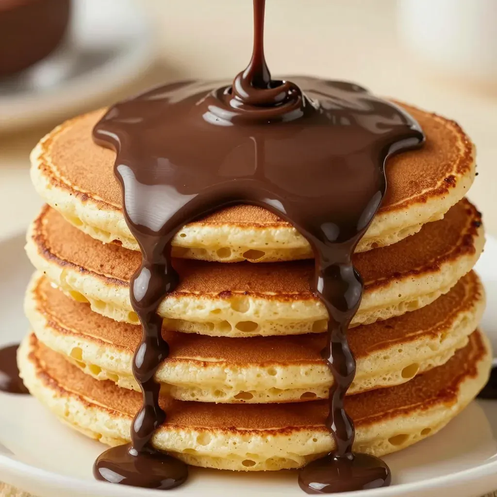 A stack of golden-brown pancakes is generously drizzled with glossy chocolate ganache, creating a rich and indulgent visual. The warm, diffused lighting highlights the texture of the pancakes and the sheen of the ganache, enhancing the cozy and appetizing atmosphere.