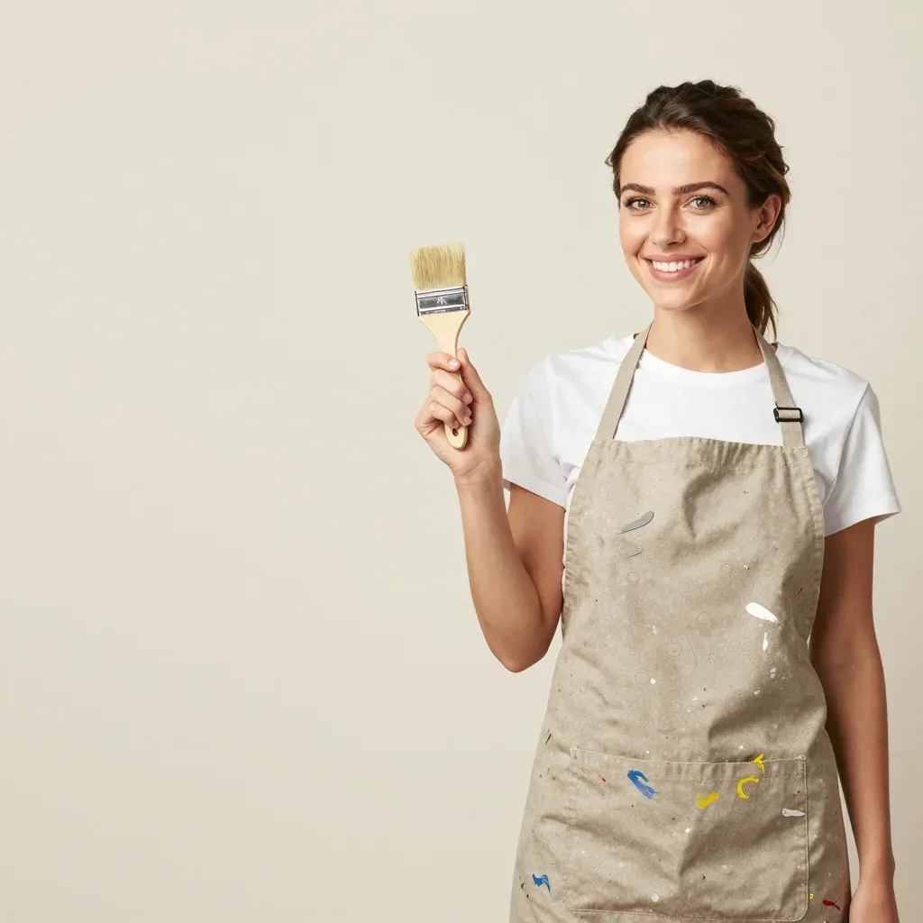 A woman in a white t-shirt and beige canvas apron with dried paint splatters holds a wooden-handled paintbrush, smiling warmly at the camera. Soft front lighting creates gentle highlights on her cheek and the brush handle, with a shallow depth of field blurring the plain taupe background to emphasize the subject.
